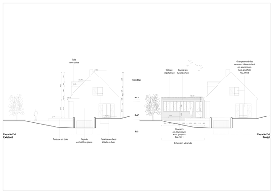 Réamanémagement d'un rez-de-chaussée d'une maison pavillonnaire avec la création d'une extension vitrée et en acier corten.